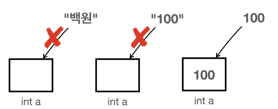 - `int a = "백원"`: 정수 타입에 정수 100(O)