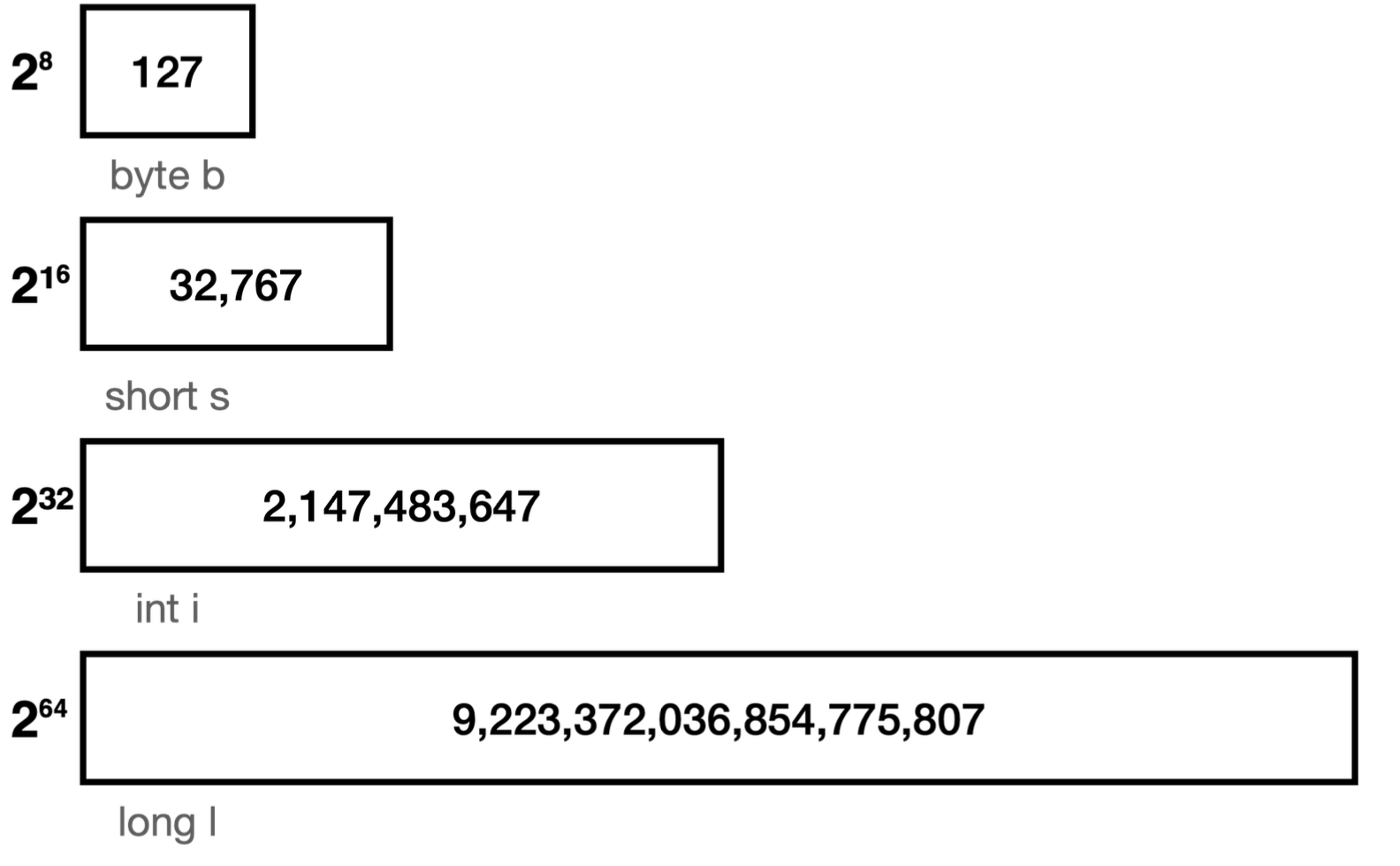 - `long`: -9,223,372,036,854,775,808 ~ 9,223,372,036,854,775,807 (8byte)
