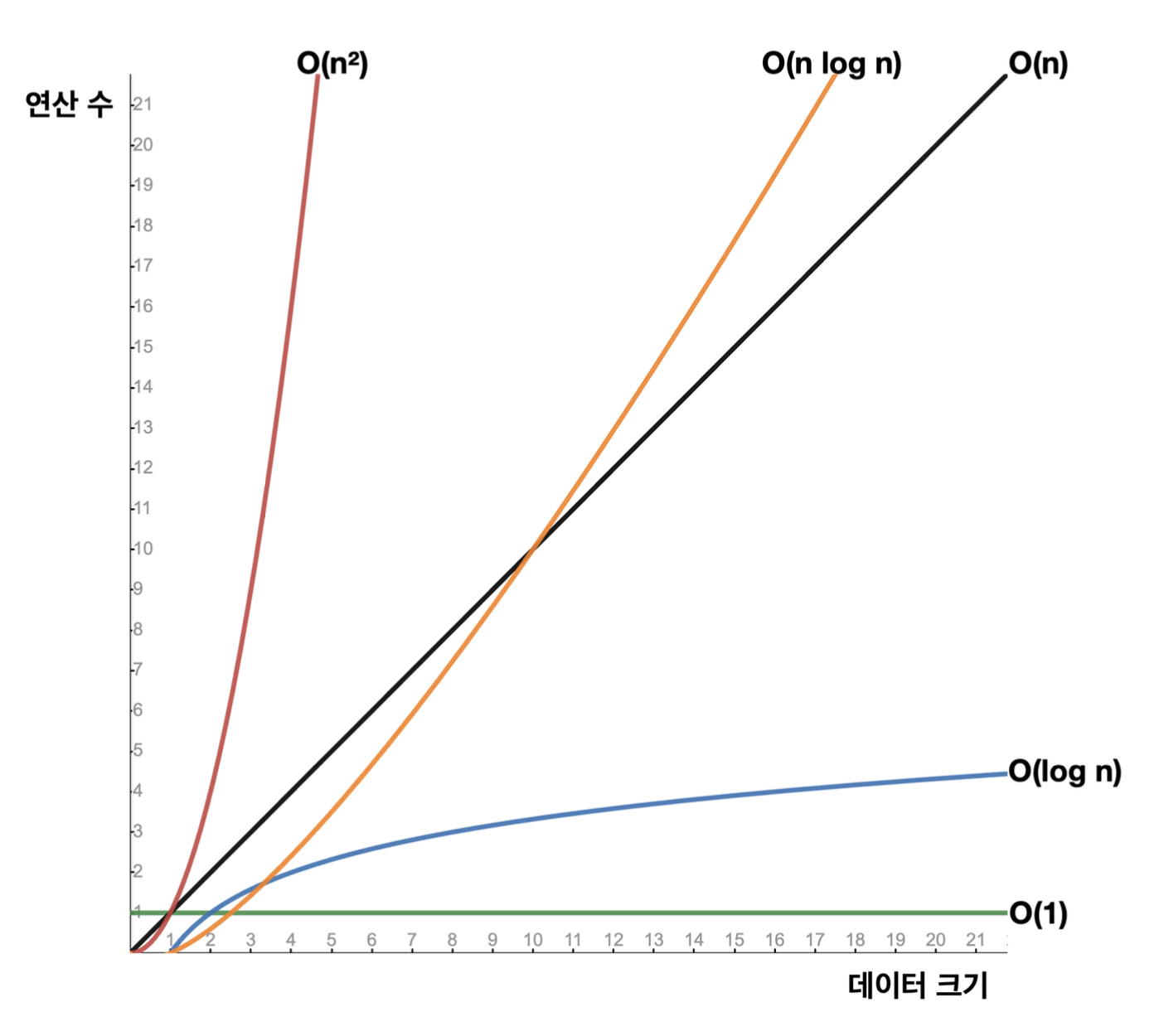 - O(1) - 상수 시간: 입력 데이터의 크기에 관계없이 알고리즘의 실행 시간이 일정하다.