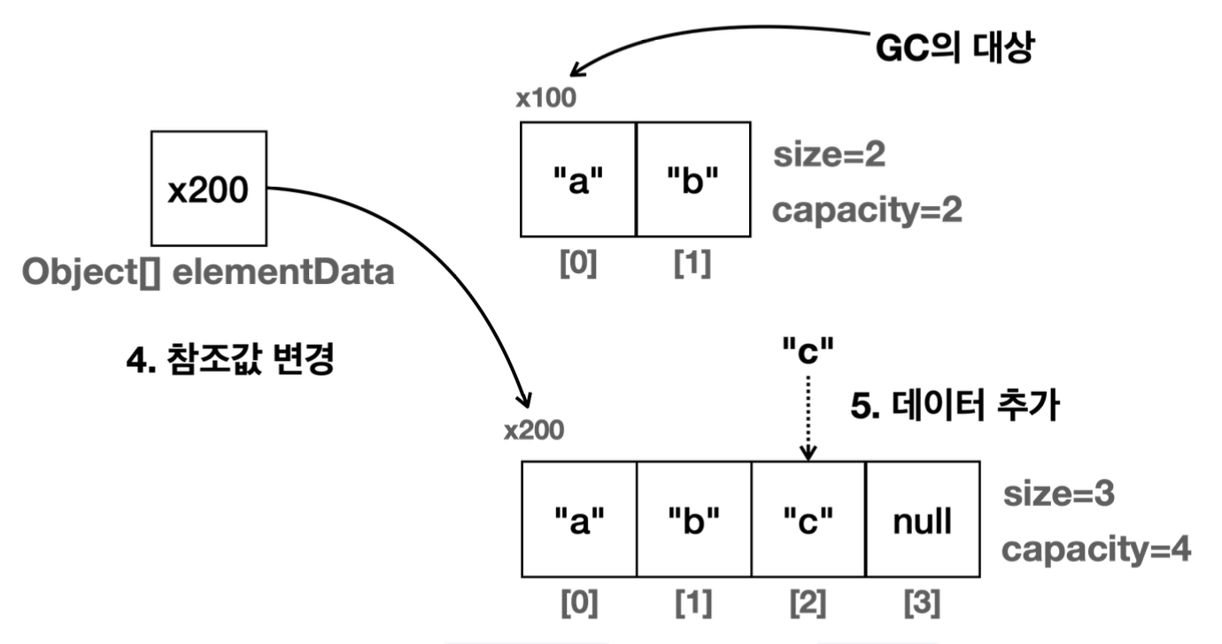 - 이렇게 되면 내부 데이터를 보관하는 `elementData`는 기본보다 2배 큰 `capacity`를 가진 배열을 보유하게 된다.