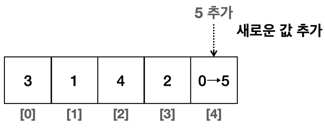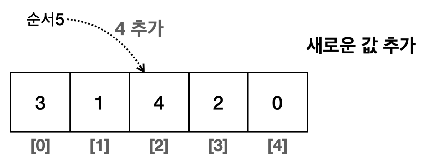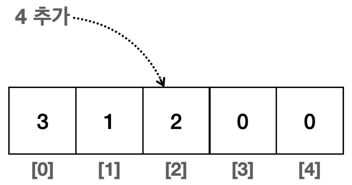 - 배열의 마지막 위치에 데이터를 추가하는 경우 여기가 배열의 마지막이다. 이 경우 기존 데이터를 이동하지 않아도 된다. 따라서 단순하게 값만 입력하면 된다.