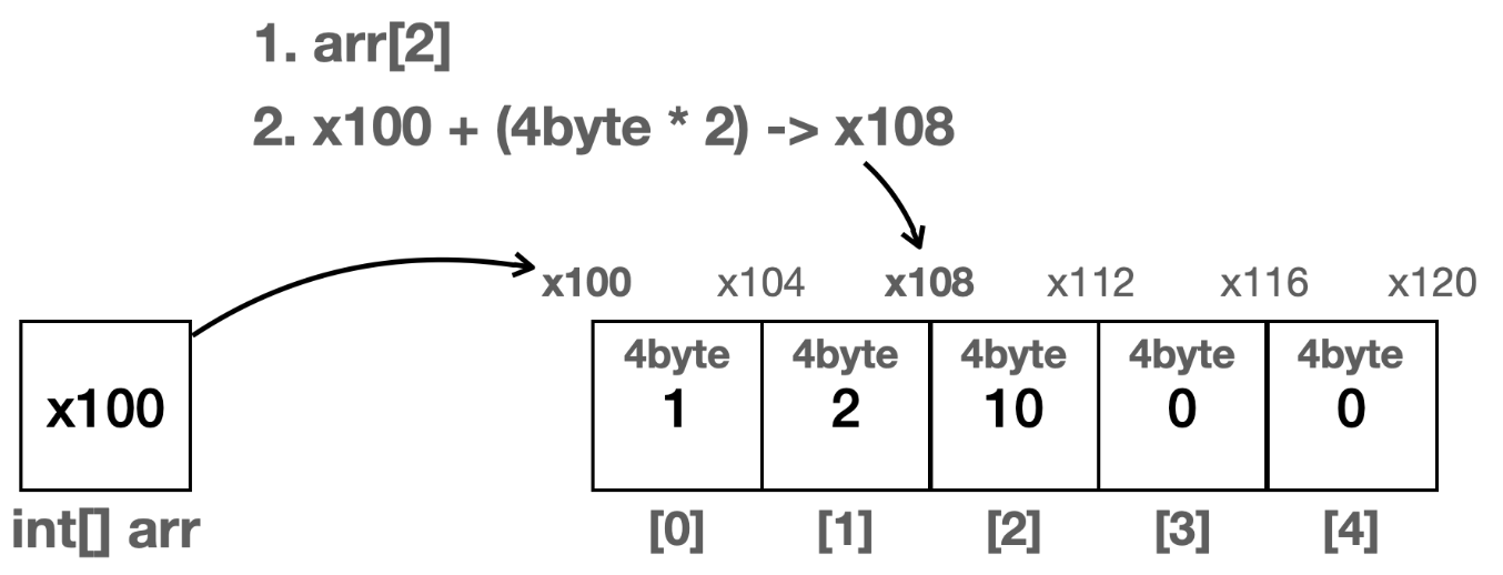 - 배열의 시작 참조(`x100`) + (자료의 크기(`4byte`) * 인덱스 위치(`2`)) = `x108`이 나온다. 여기에는 숫자 10이 들어있다.