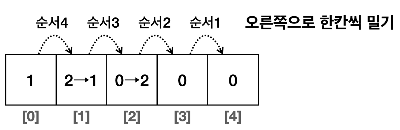 - 이때 배열의 마지막 부분부터 오른쪽으로 밀어야 데이터를 유지할 수 있다.