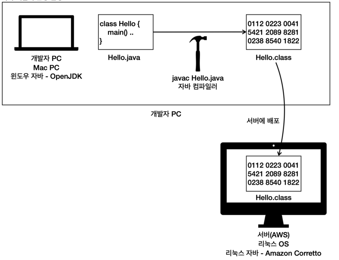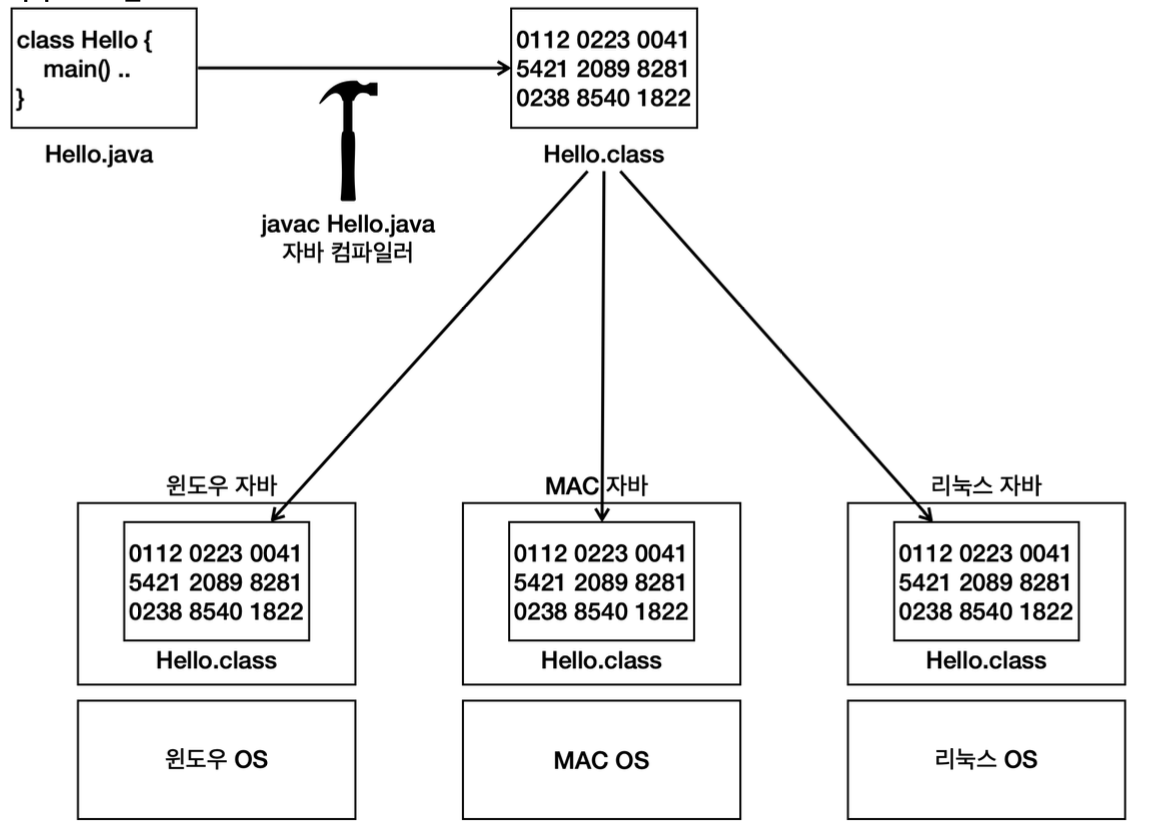 - 자바 개발자는 특정 OS에 맞추어 개발을 하지 않아도 된다. 자바에 맞추어 개발하면 된다. OS 호환성 문제는 자바가 해결한다. `Hello.class`와 같이 컴파일된 자바 파일은 모든 자바 환경에서 실행할 수 있다.