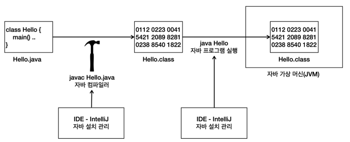 - 자바 코드를 컴파일 하려면 `javac`라는 프로그램을 직접 사용해야 하는데 인텔리제이는 자바 코드를 실행할 때 이 과정을 자동으로 처리해준다.