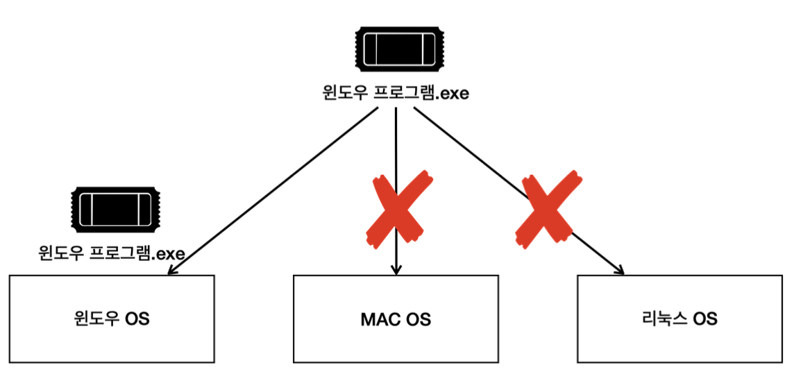 - 예를 들어서 윈도우 프로그램은 MAC이나 리눅스에서 작동하지 않는다. 왜냐하면 윈도우 프로그램은 윈도우 OS가 사용하는 명령어들로 구성되어 있기 때문이다. 해당 명령어는 다른 OS와는 호환되지 않는다.