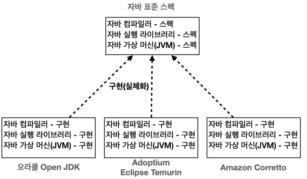 - 이 표준 스펙을 기반으로 여러 회사에서 실제 작동하는 자바를 만든다.