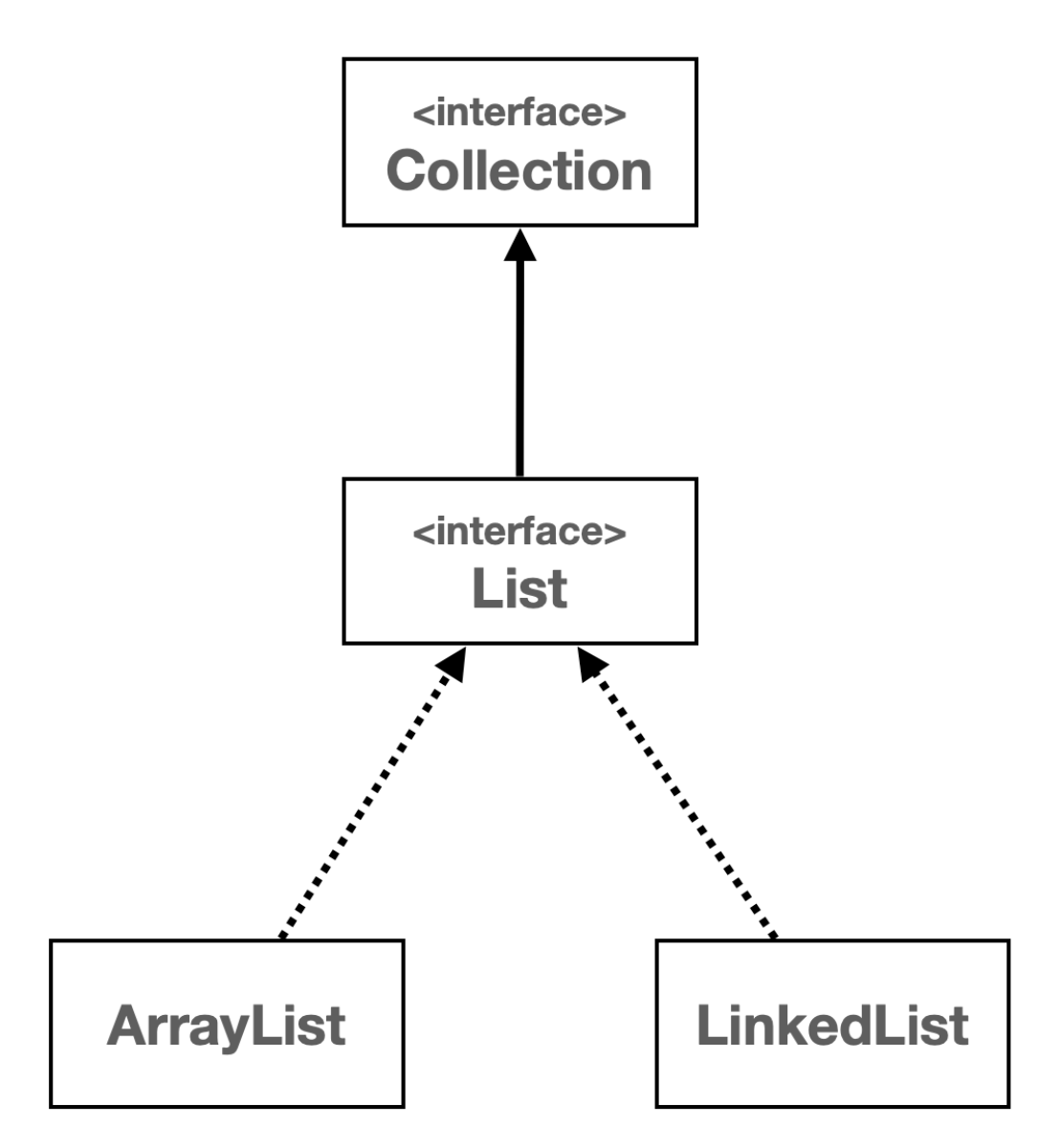 순서가 있고 중복을 허용하는 자료 구조를 리스트(`List`)라 한다. `MyArrayList`와 `MyLinkedList`는 내부 구현만 다를 뿐 같은 기능을 제공하는 리스트이다. 이 둘의 공통 기능을 인터페이스로 뽑아서 추상화하면 다형성을 활용한 다양한 이득을 얻을 수 있다.