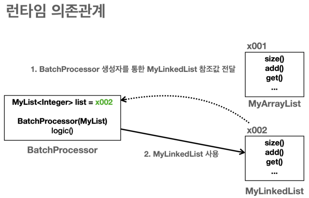 - 어떤 `MyList list`의 구현체를 선택할 지는 실행 시점에 생성자를 통해서 결정한다.