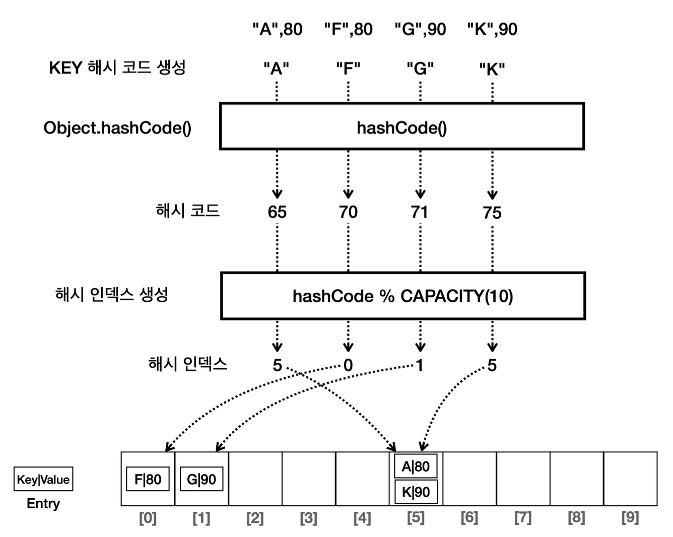 - `Key`뿐만 아니라 값(`Value`)을 추가로 저장해야 하기 때문에 `Entry`를 사용해서 `Key`, `Value`를 하나로 묶어서 저장한다.