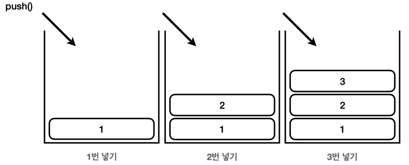 전통적으로 스택에 값을 넣는 것을 `push`라 하고, 스택에서 값을 꺼내는 것을 `pop`이라 한다.
