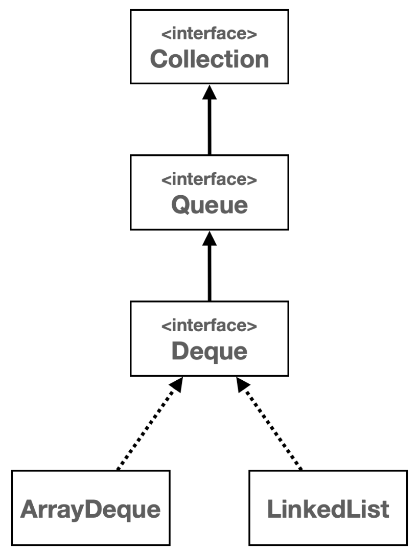 `Deque`는 `Queue`를 위한 메서드 이름까지 제공하는 것을 확인할 수 있다. `Deque` 인터페이스는 `Queue` 인터페이스의 자식이기 때문에, 단순히 `Queue`의 기능만 필요하면 `Queue` 인터페이스를 사용하고, 더 많은 기능이 필요하다면 `Deque` 인터페이스를 사용하면 된다.