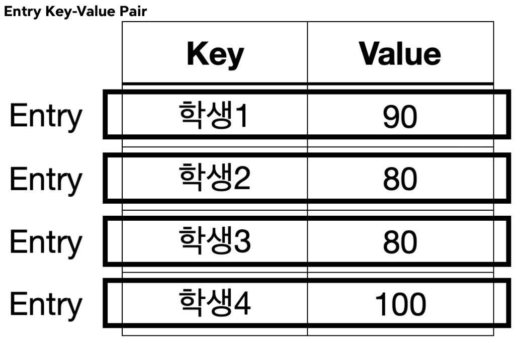 쉽게 이야기해서 `Map`에 키와 값으로 데이터를 저장하면 `Map`은 내부에서 키와 값을 하나로 묶는 `Entry` 객체를 만들어서 보관한다. 참고로 하나의 `Map`에 여러 `Entry`가 저장될 수 있다.