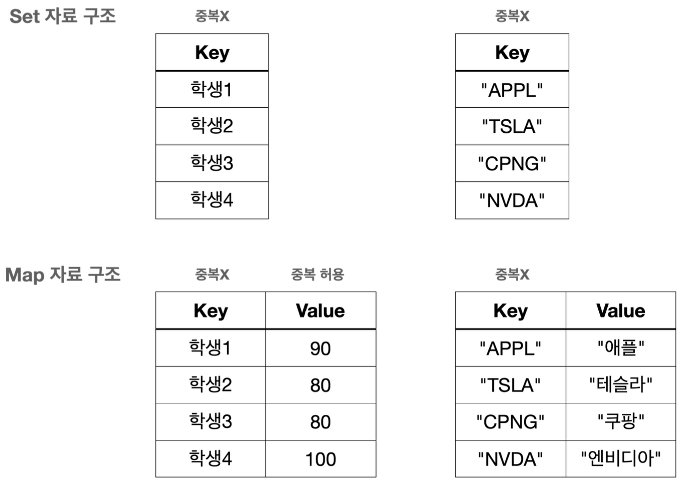 `Map`과 `Set`은 거의 같다. 단지 옆에 `Value`를 가지고 있는가 없는가의 차이가 있을 뿐이다.