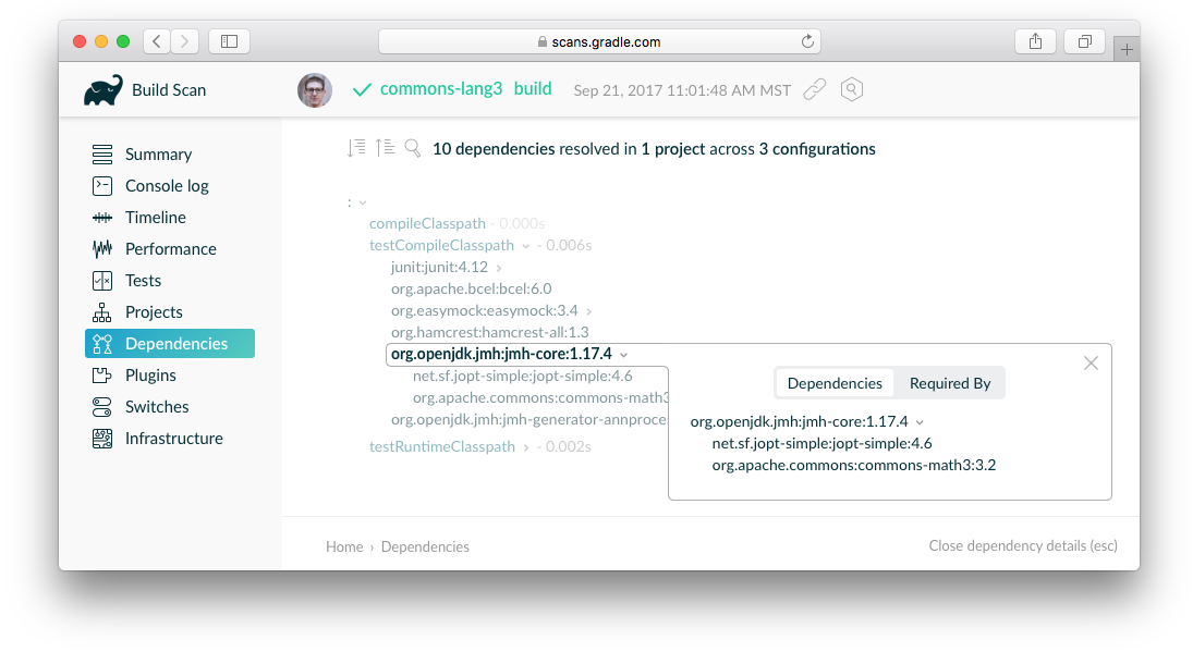 - Build Scan™: Gradle은 빌드를 디버그하고 최적화하는 데 도움을 주는 인터랙티브 웹 기반 UI를 제공한다. 이를 통해 조직은 빌드 이력을 수집하고, 트렌드 분석을 수행하며, 디버깅을 위해 빌드를 비교하거나 빌드 시간을 최적화할 수 있다.