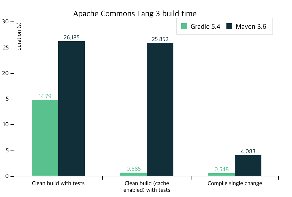 이와 같은 성능 기능들로 인해, 거의 모든 시나리오에서 Gradle이 Maven보다 두 배 이상 빠르며, 빌드 캐시를 사용하는 대형 빌드에서는 최대 100배 빠르다.